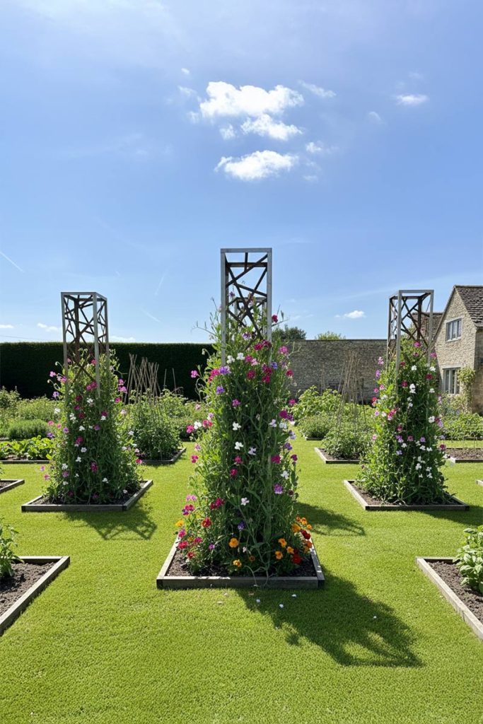 In the dormant season when most climbers have lost their foliage and flowers these obelisks rise from herbaceous and deciduous planting like mini skyscrapers, this is when they really come into their own providing striking winter interest. So with an Obelisk once the climbers adorning it have finished flowering the show goes on.