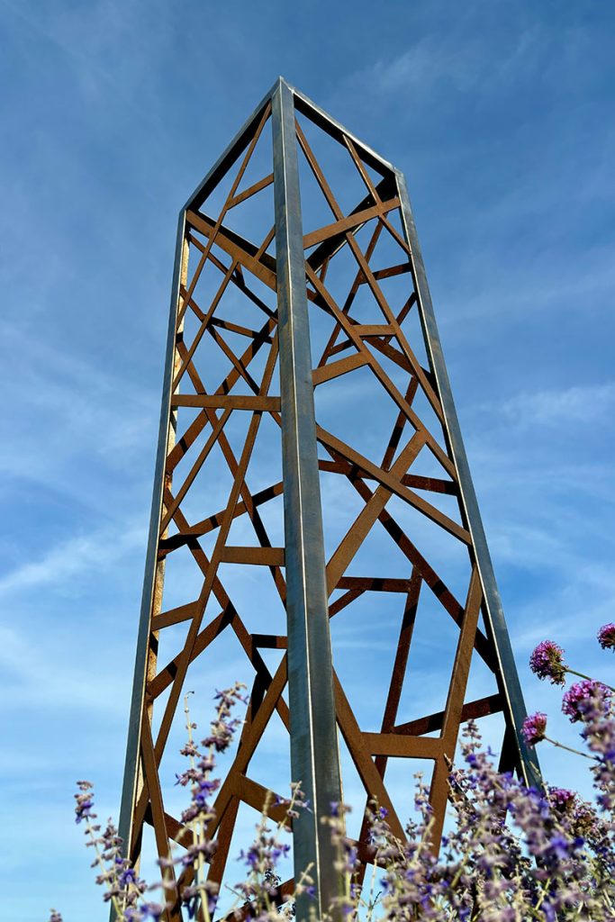 The Obelisk is contemporary and proud, standing 2 meters tall (once installed). The rigid stainless steel outer frame contains random internal weathered steel latticework. The weathered steel contrasts with the silver stainless and provides perfect support for climbers.